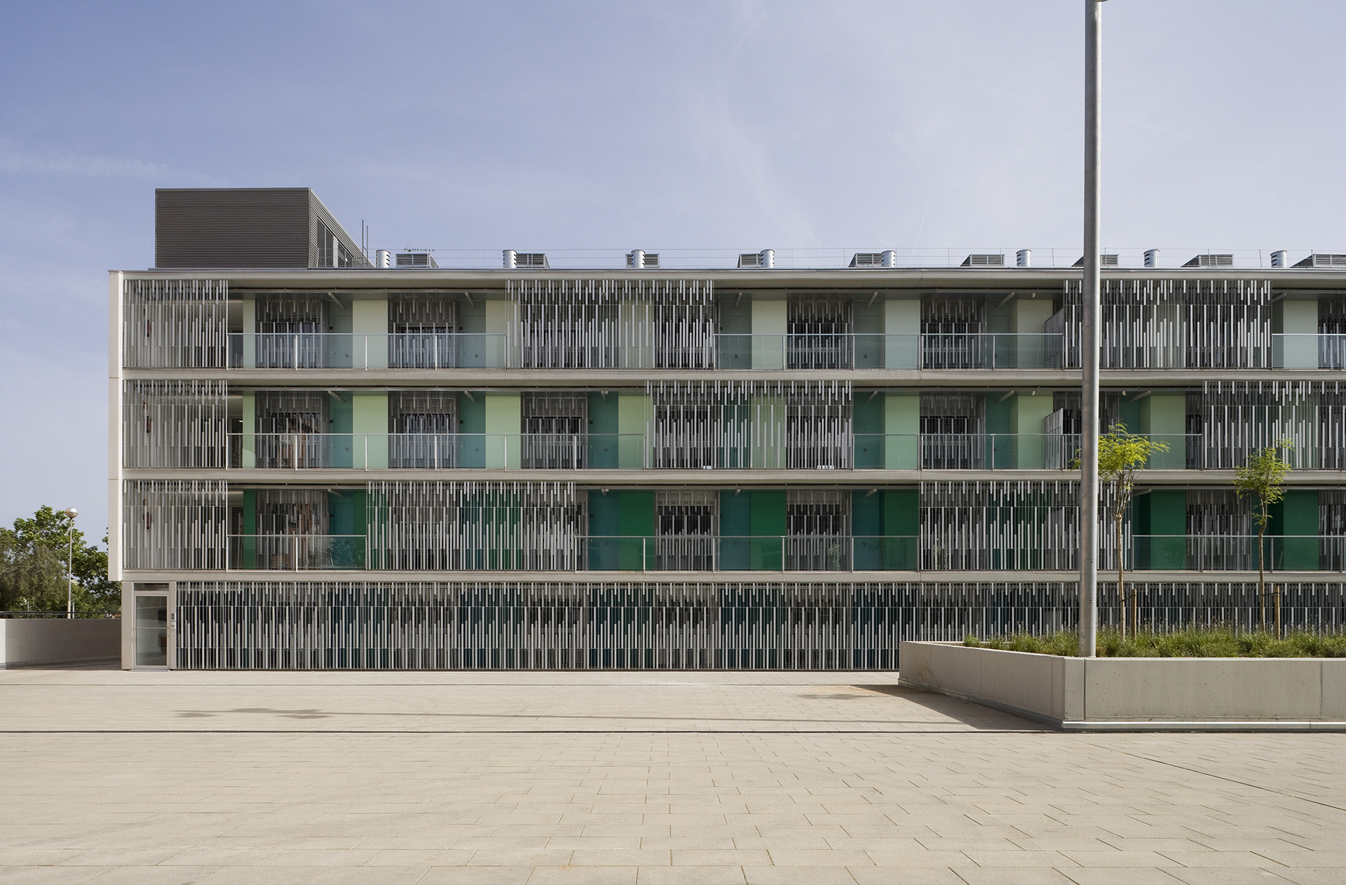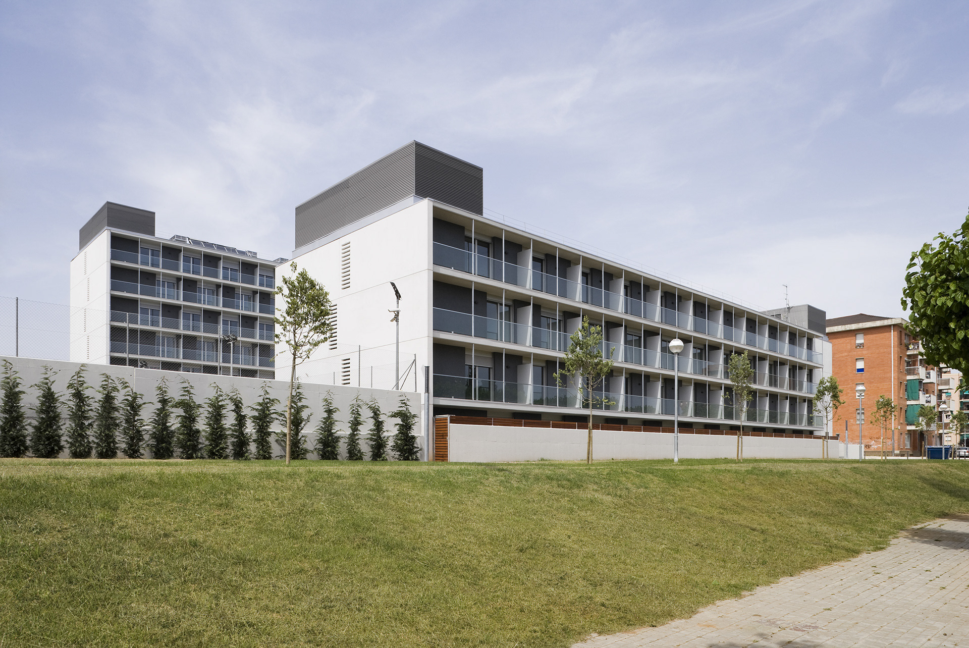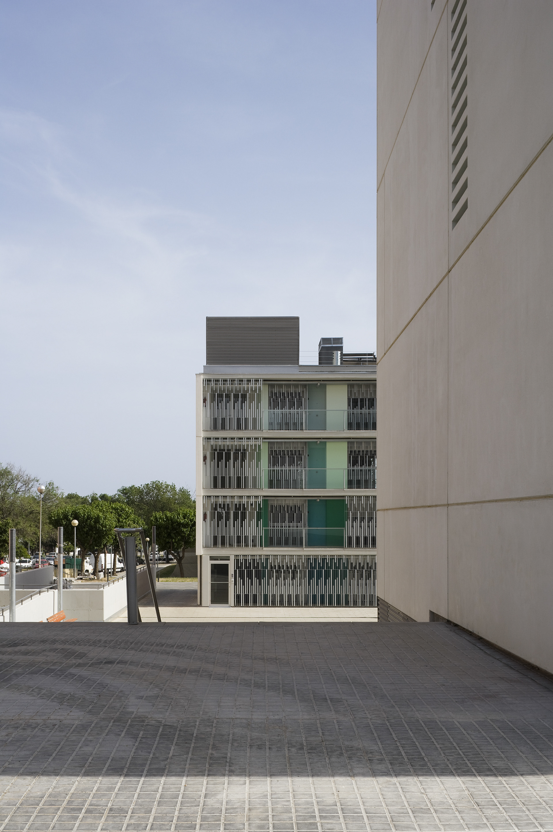 MATARÓ, 2009 Edificis destinats al habitatges de lloguer social per a joves, tenint en compte l’ús principal de parelles joves, es va decidir plantejar un model d’apartament que proposés noves formes de viure, alternatives a l’ús tradicional de l’habitatge mínim. El conjunt consta de dos blocs lineals entre els que s’organitza una gran plaça pública. Des d’aquesta plaça també es dóna accés a l’aparcament. Els blocs d’habitatges s’organitzen amb una passera que dóna accés als habitatges, aquests d’uns 50m2 tenen un balcó orientat a sud.
