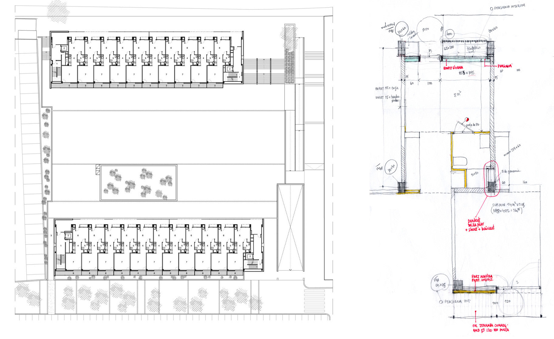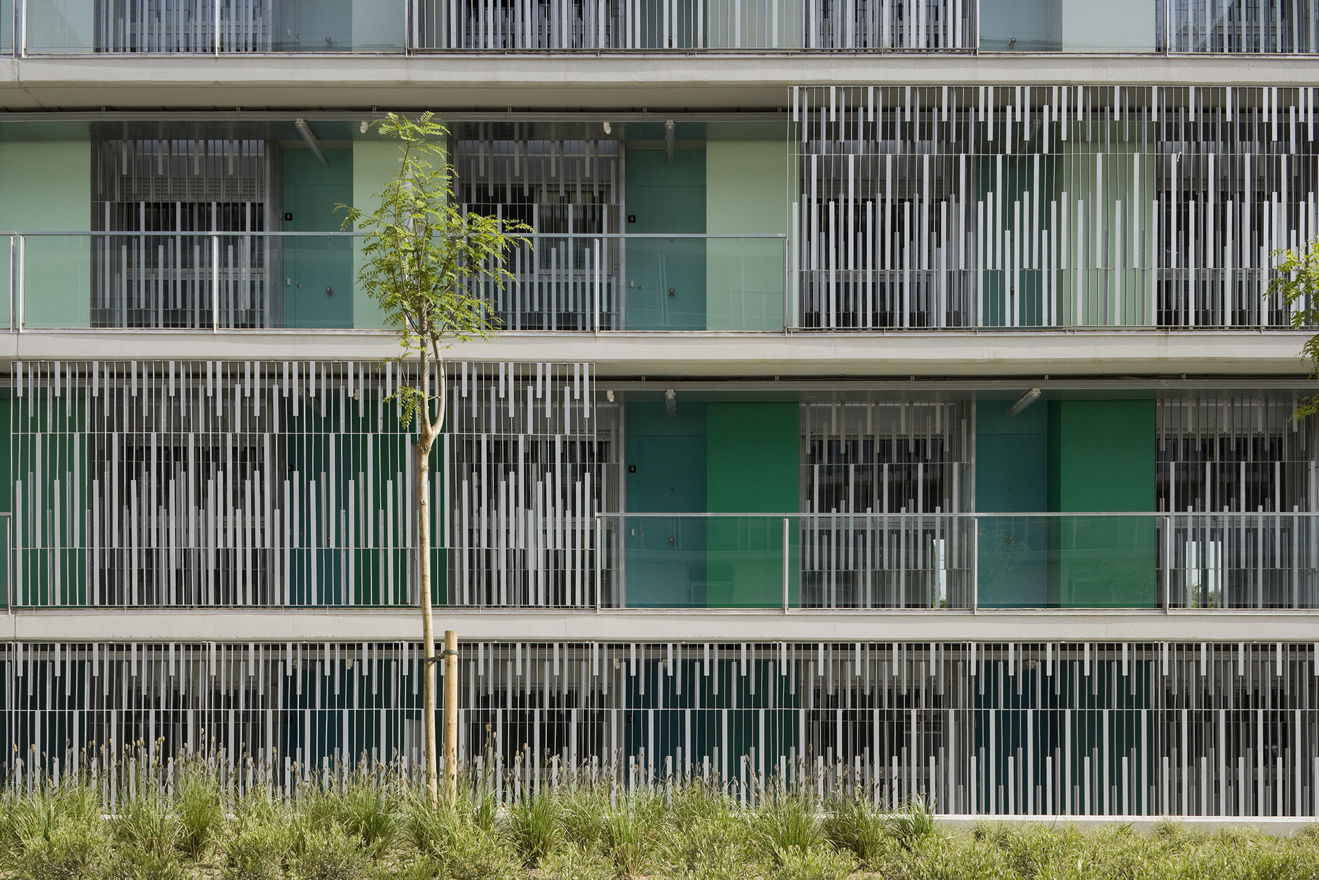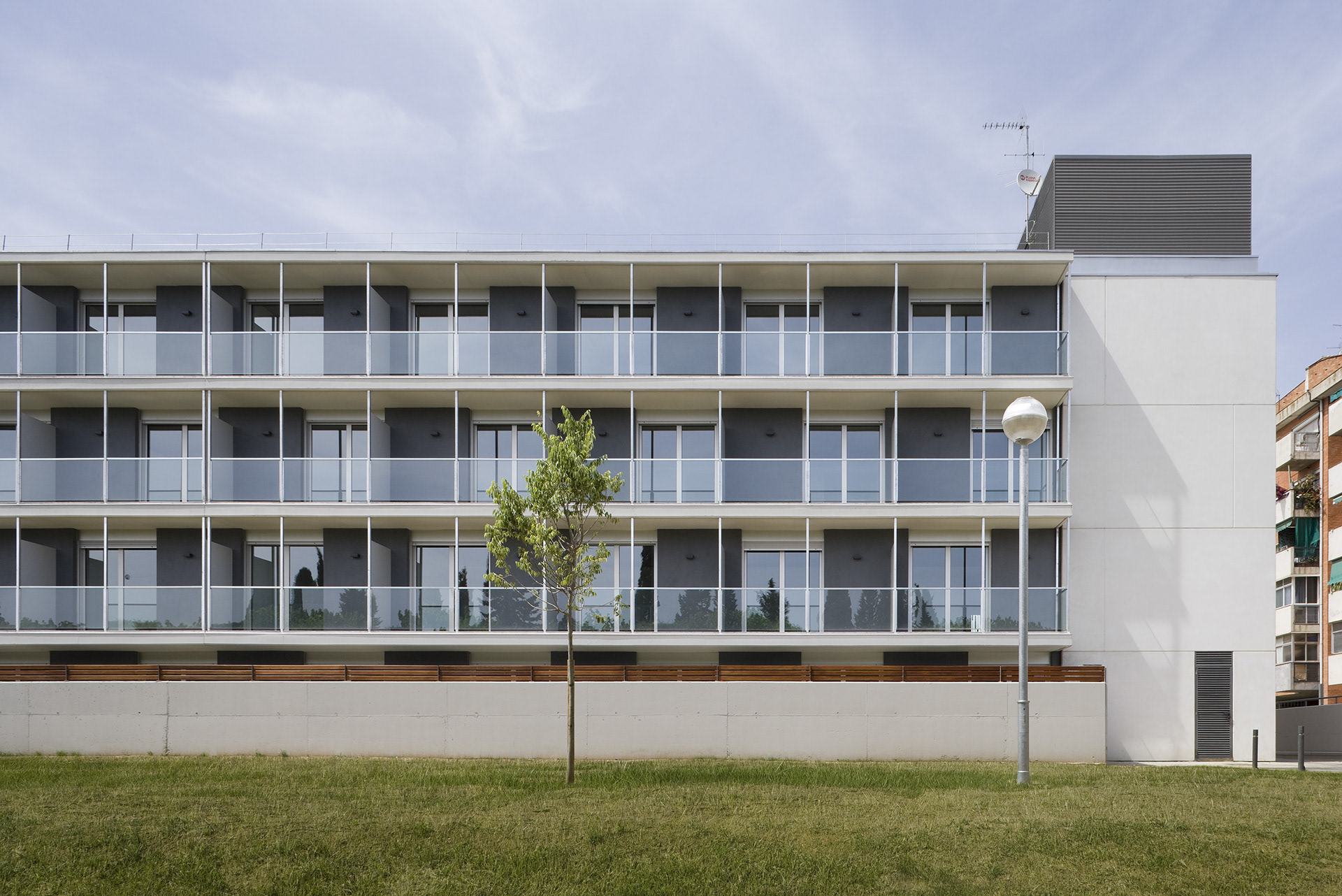 MATARÓ, 2009 Edificis destinats al habitatges de lloguer social per a joves, tenint en compte l’ús principal de parelles joves, es va decidir plantejar un model d’apartament que proposés noves formes de viure, alternatives a l’ús tradicional de l’habitatge mínim. El conjunt consta de dos blocs lineals entre els que s’organitza una gran plaça pública. Des d’aquesta plaça també es dóna accés a l’aparcament. Els blocs d’habitatges s’organitzen amb una passera que dóna accés als habitatges, aquests d’uns 50m2 tenen un balcó orientat a sud.